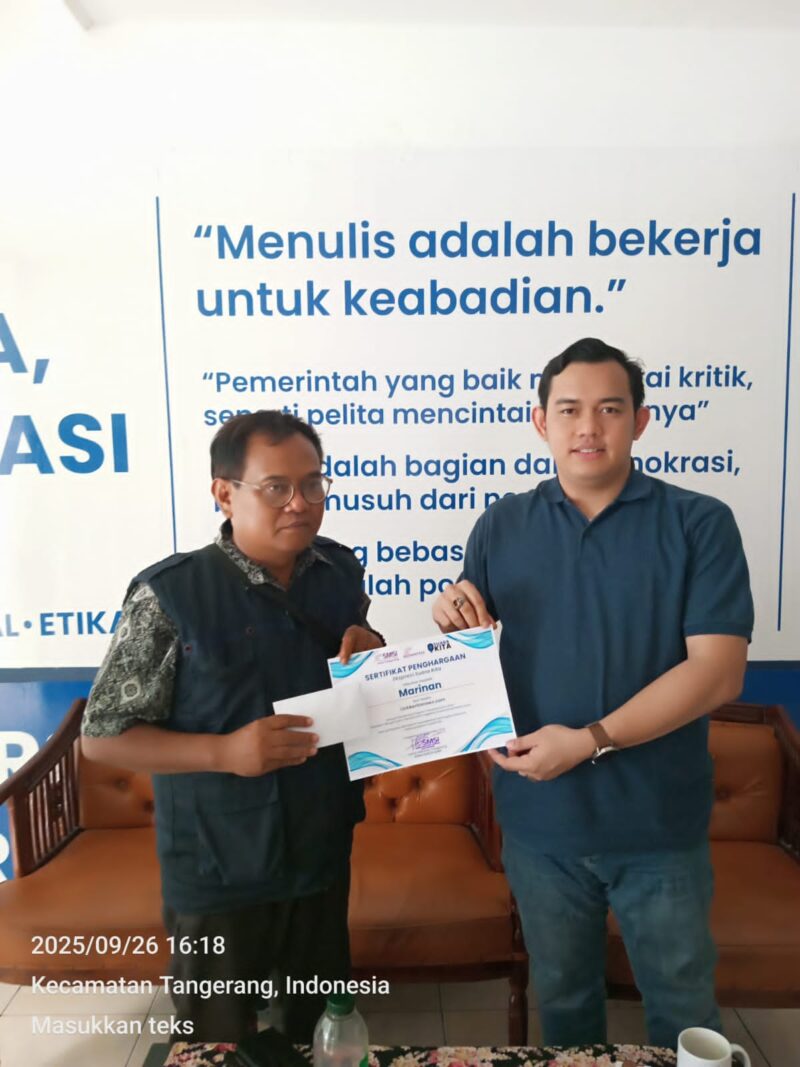 Tangerang – Suasana penuh apresiasi mewarnai acara Ekspresi Suara Kita episode 2 yang mengangkat tema “Transparansi Anggaran dan Kolaborasi Media Lokal”. Dalam kesempatan tersebut, Ketua Serikat Media Siber Indonesia (SMSI) Kota Tangerang, Azhari Zaki Al Qodri, secara resmi menyerahkan sertifikat penghargaan kepada Marinan, salah satu wartawan yang dinobatkan sebagai Penulis Terbaik.”Jum’at (26/9/25)