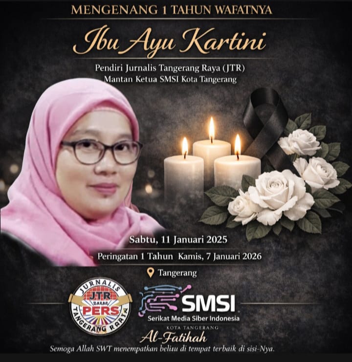 KOTA TANGERANG -Tepat satu tahun kepergian Ibu Ayu Kartini pada 8 Januari 2025, insan pers Tangerang Raya mengenang jasa dan keteladanan almarhumah yang dikenal sebagai Pendiri Jurnalis Tangerang Raya (JTR) sekaligus mantan Ketua Serikat Media Siber Indonesia (SMSI) Kota Tangerang.