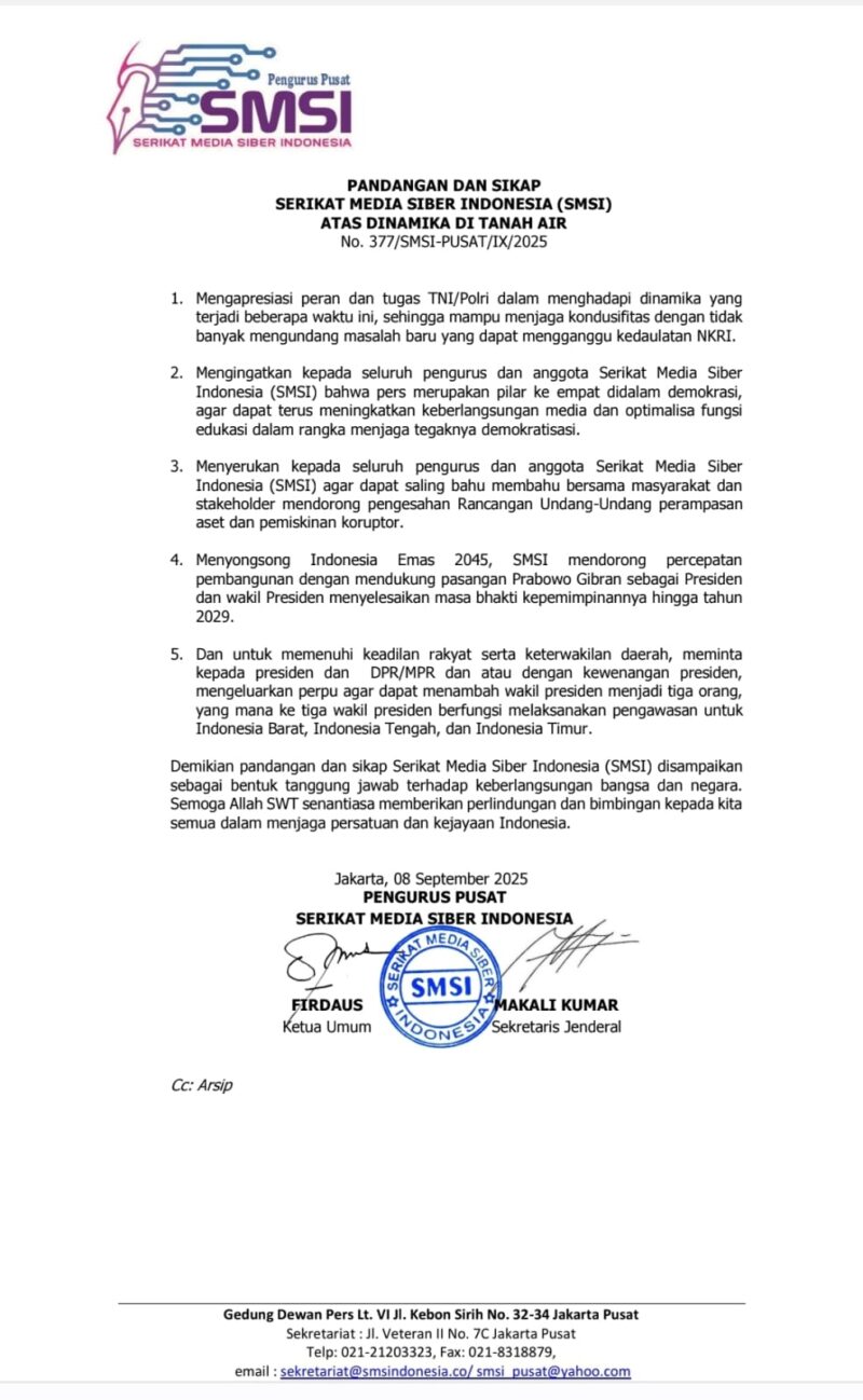 Jakarta – Serikat Media Siber Indonesia (SMSI) menyikapi situasi di tanah air dalam beberapa pekan terakhir, menyampaikan pandangan dan imbauan, dalam keterangan resmi yang ditandatangani oleh Firdaus selaku Ketua Umum SMSI Pusat, dan Makali Kumar selalu Sekretaris Jenderal, Senin (8/9/2025), Ketua Umum Serikat Media Siber Indonesia (SMSI) Pusat Firdaus menyatakan, pertama, mengapresiasi peran dan tugas TNI/Polri dalam menghadapi dinamika yang terjadi beberapa waktu ini, sehingga mampu menjaga kondusifitas dengan tidak banyak mengundang masalah baru yang dapat mengganggu kedaulatan NKRI.